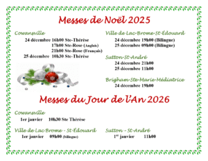 | 9h00 | Lac-Brome | Église St-Édouard | Bilingue |