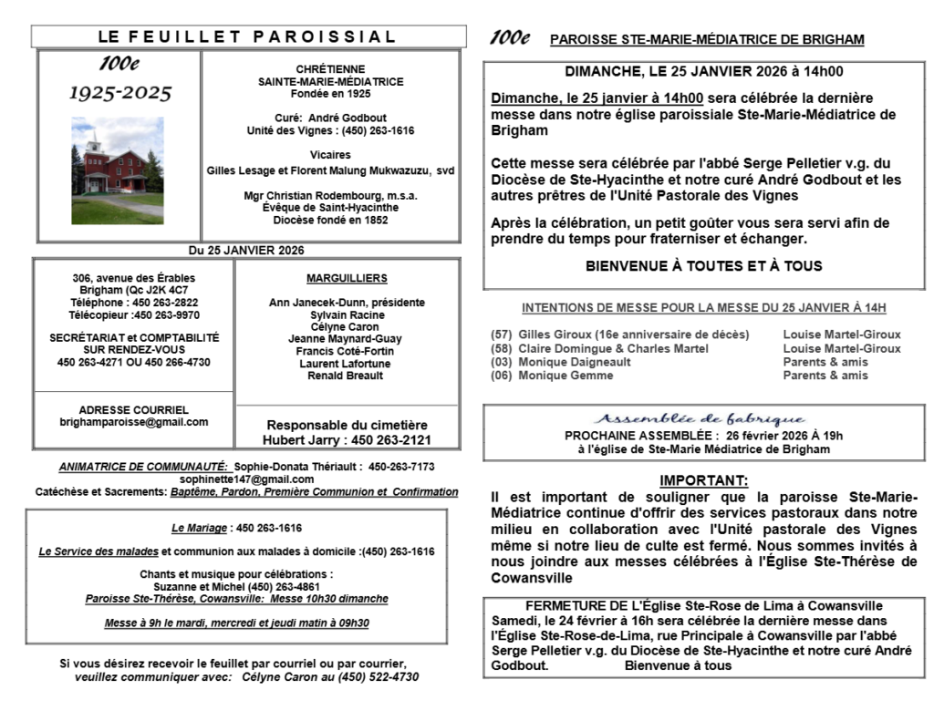 | 9h00 | Brigham | Église Ste-Marie-Médiatrice | |